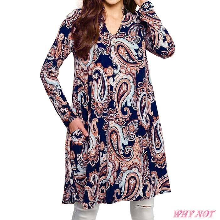 ワンピース 長袖 Vネック スワンカラー ペイズリープリント 長めチュニック LAインポート S.M.L ダークネイビー FROM USA TT221223LA019 | インポートアパレルホワイノット