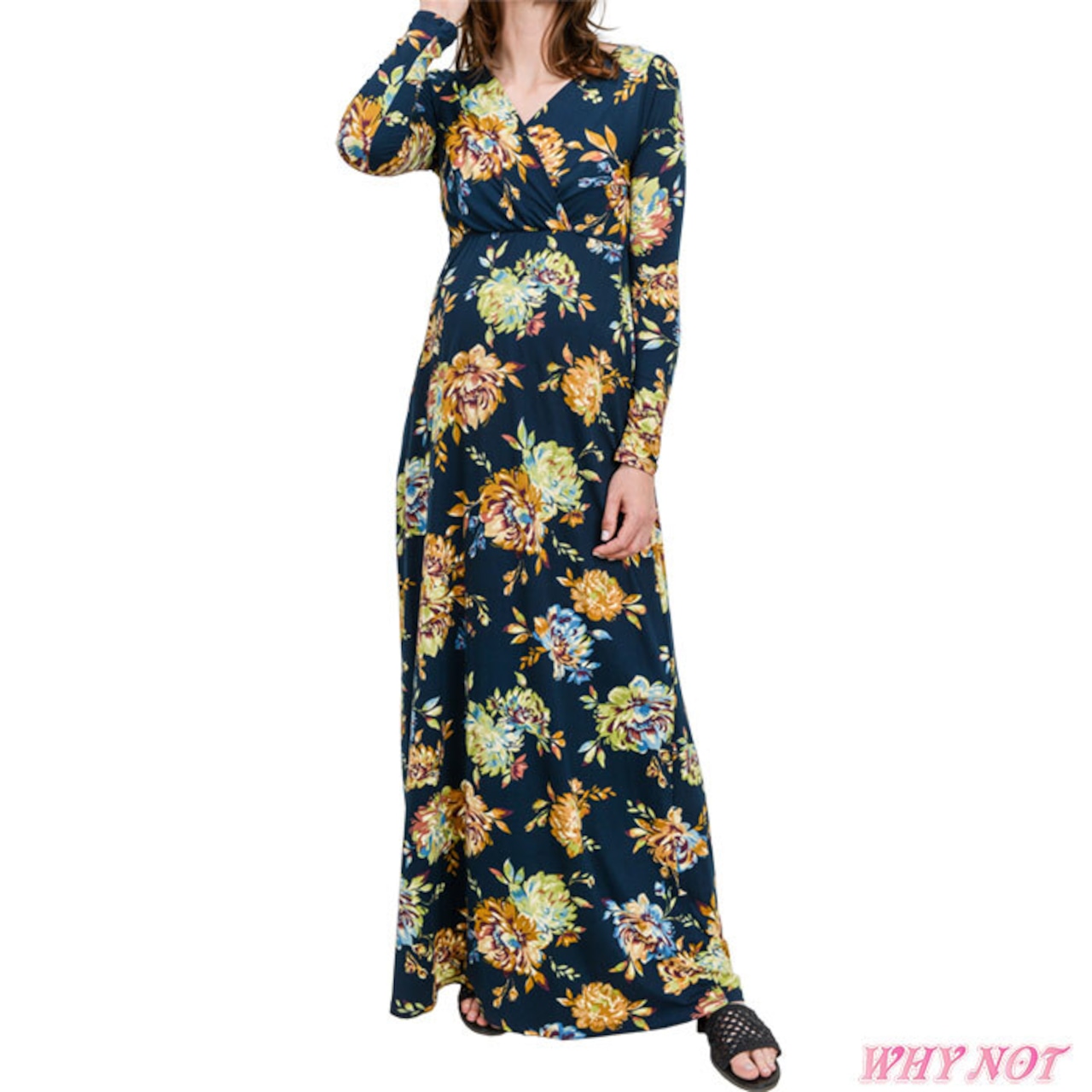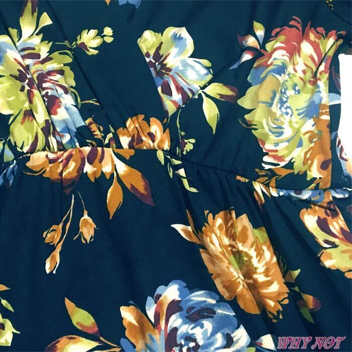 ワンピース マキシ 長袖 Vネック ハイウエスト切り替えプリーツ LAインポート 花柄 S.M.L.XL ダークネイビーブルー MADE IN USA HM230218LA065 | インポートアパレルホワイノット