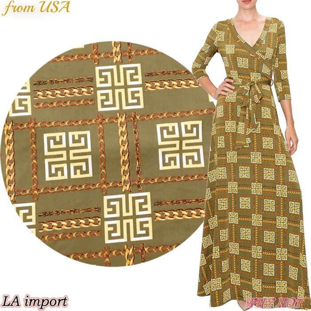 ワンピース マキシ 7分袖 Vネック カシュクール LAインポート 幾何学チェーン柄 Aライン ラップワンピース S.M.L.XL オリーヴ MADE IN USA JN230517LA054 | インポートアパレルホワイノット